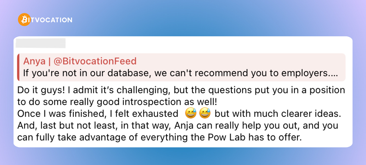 This approach helps us maintain high signal and trust — both for candidate recommendations and for the community itself. People don’t just join the POW Lab to find opportunities; they join to spend time with other Bitcoiners.