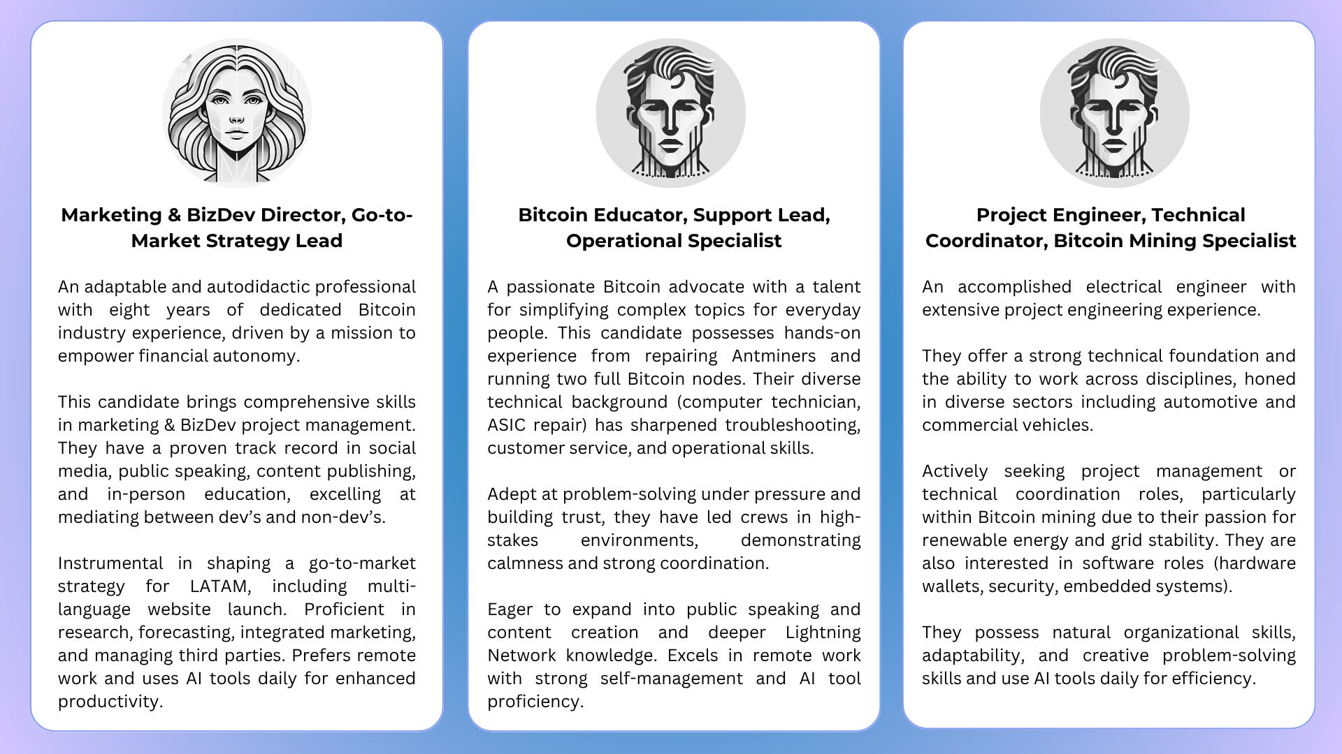 We have incredible Bitcoin professionals in our talent pool. Here’s a selection: