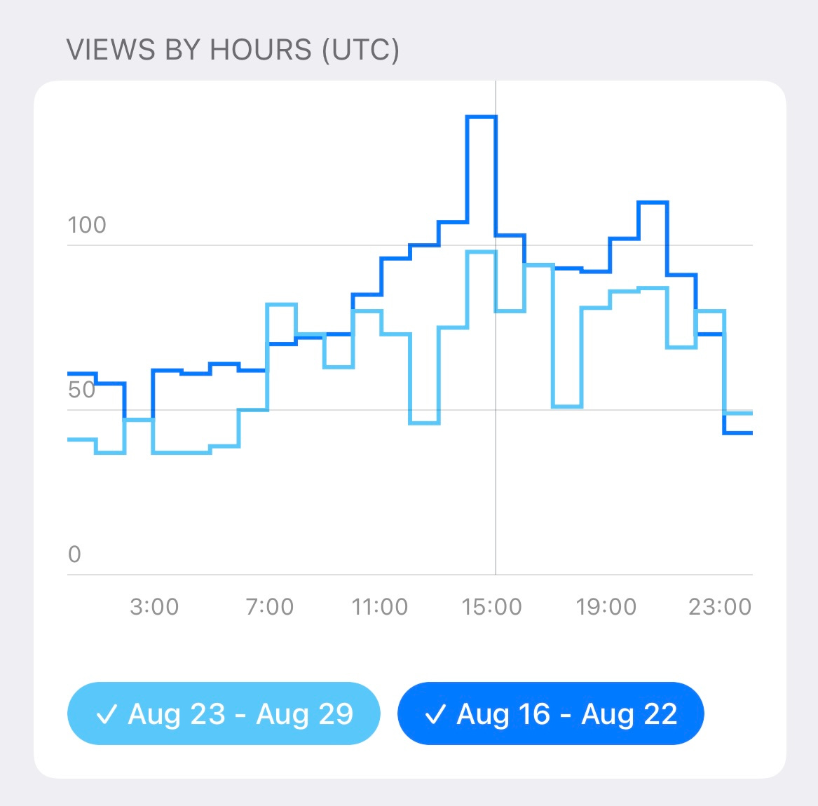We get the most views around 3pm and 9pm UTC every day.