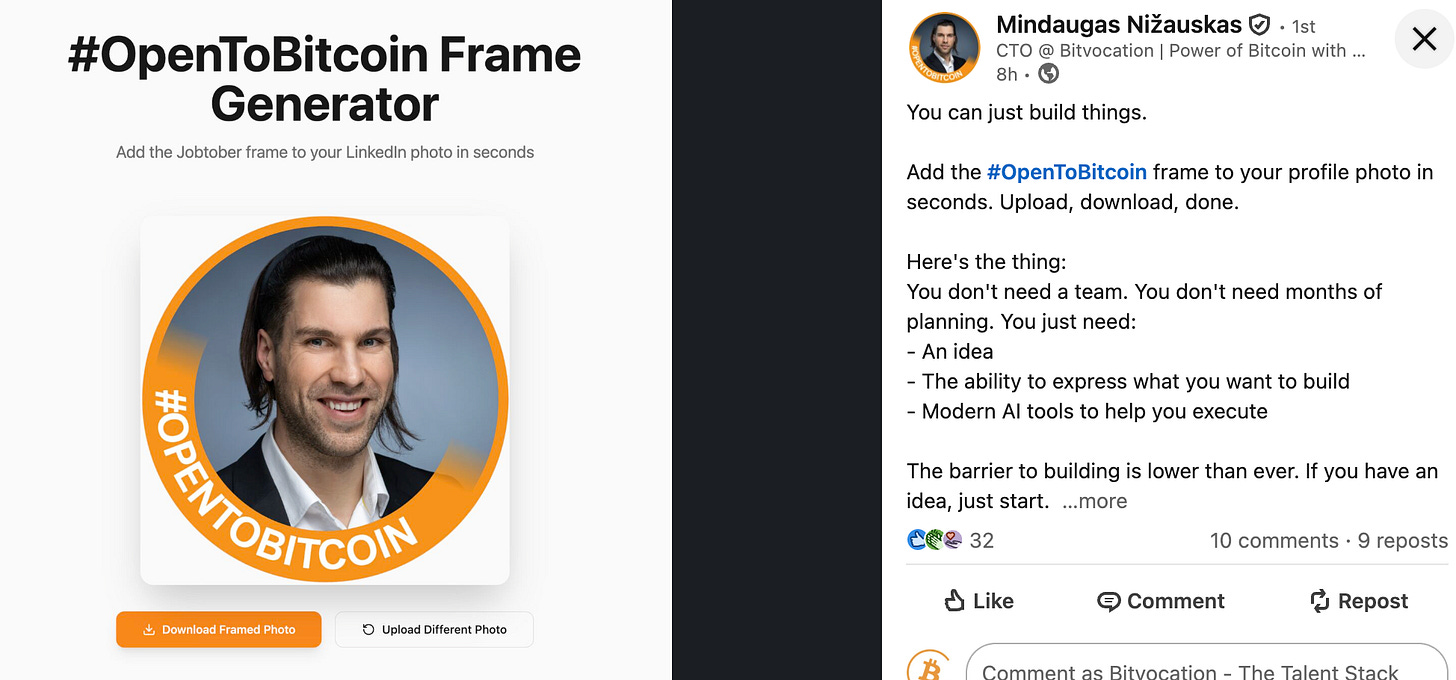 People keep asking us how to change their LinkedIn profile pic to the orange #opentobitcoin frame. We had instructions in the Jobtober Day 2 lesson, but they were sooo “February 2025” and took at least 5 minutes to make.