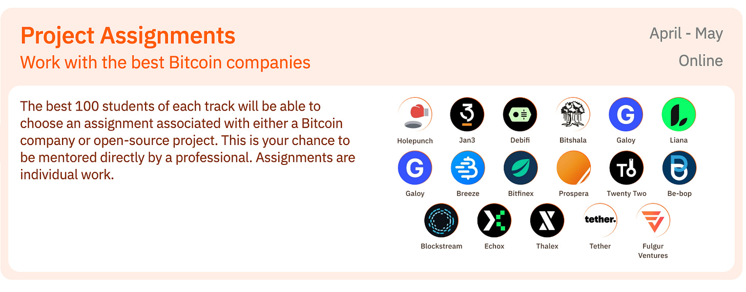 The Plan ₿ Program is a 5-month, part-time program designed for people looking to enter the Bitcoin industry. Built around how the industry actually works, it combines Bitcoin fundamentals with expert-led masterclasses, hands-on projects, and direct exposure to companies and builders in the space.Alumni have gone on to work in Bitcoin startups, education, and infrastructure.