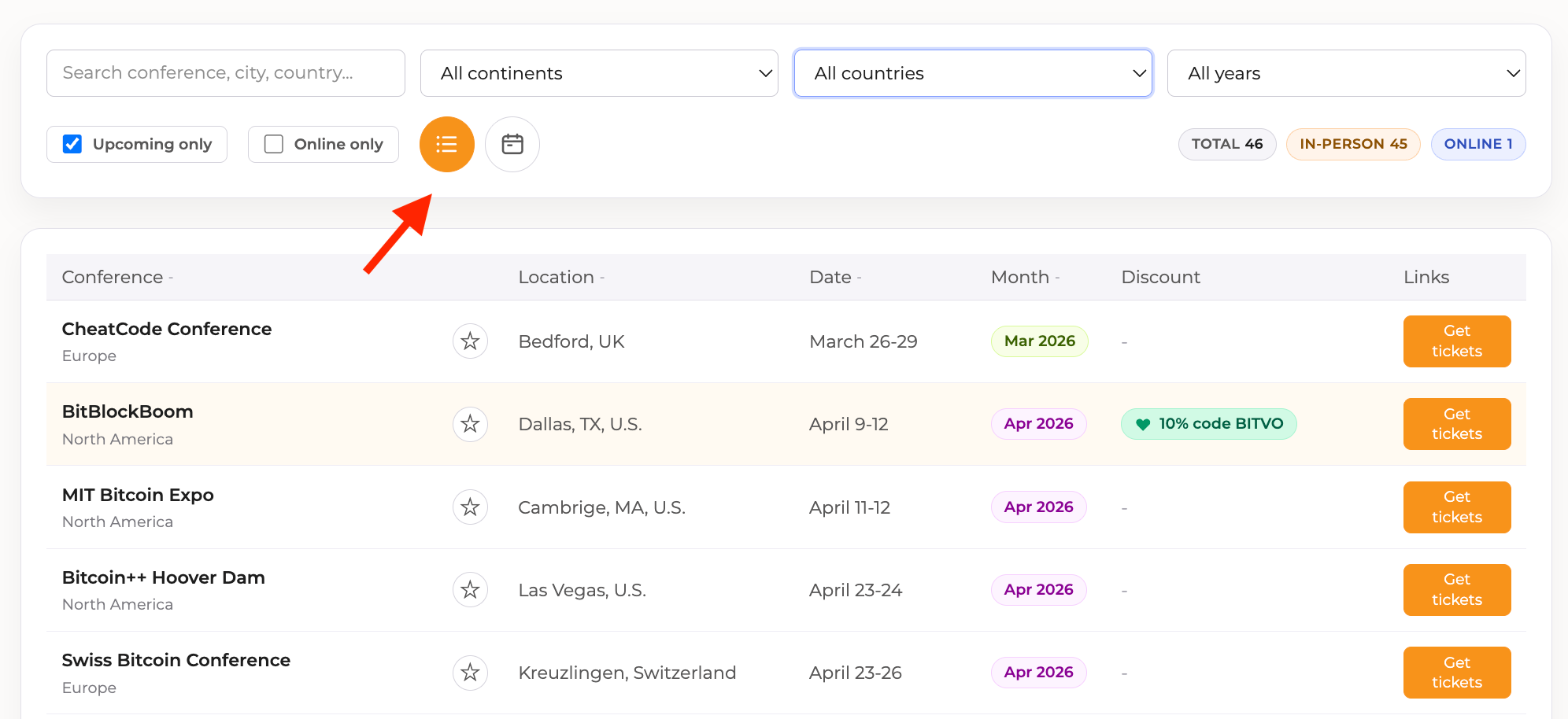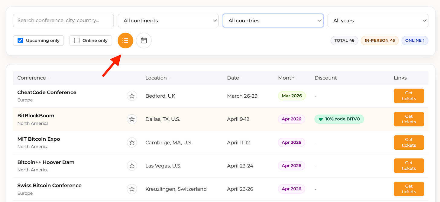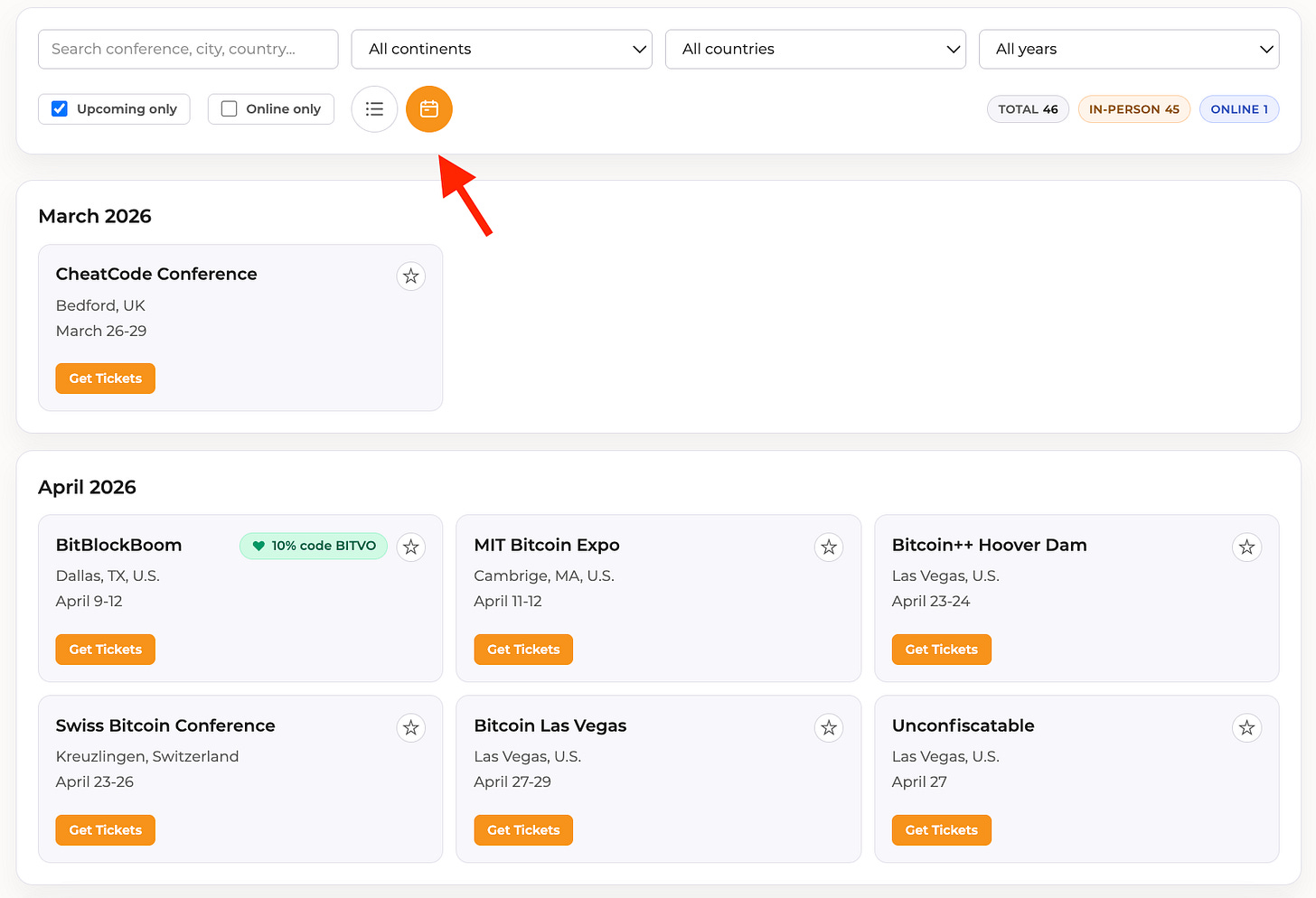The conference page is free, public, and updated regularly. Pass it along to anyone in your network navigating the Bitcoin event calendar this year.